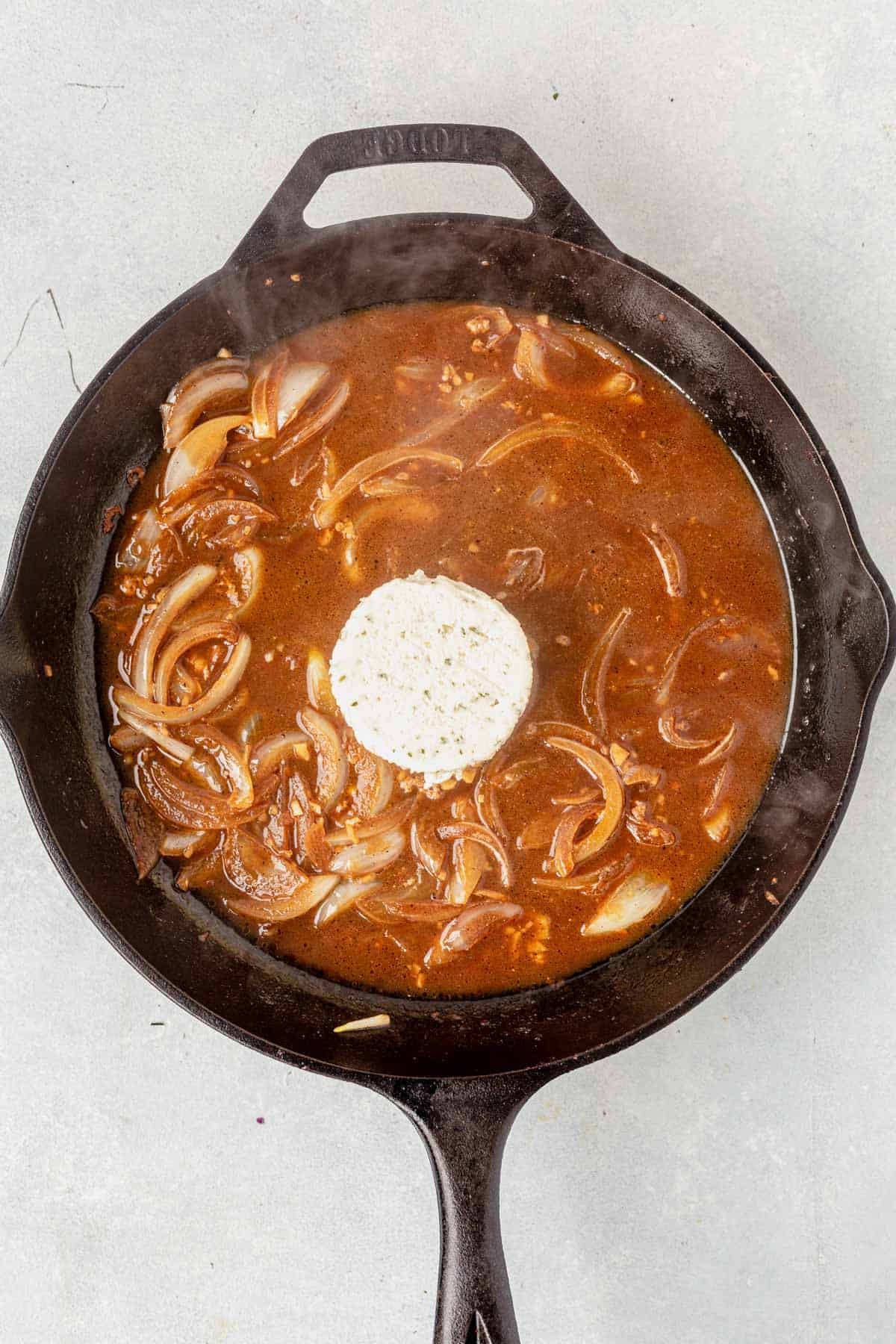 - Stir in the Boursin cheese: Deglaze the pan with wine and chicken broth then stir in the Boursin cheese until it’s melted and creamy.