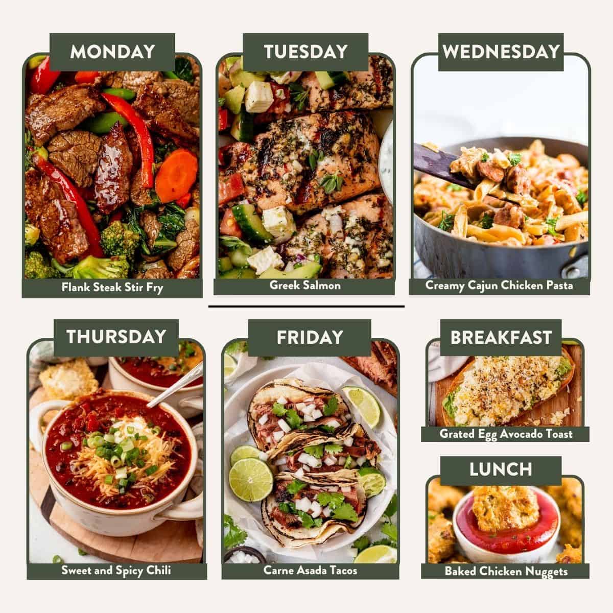 Monday: Flank Steak Stir Fry | Tuesday: Greek Salmon | Wednesday: One Pot Creamy Cajun Chicken Pasta | Thursday: Sweet and Spicy Chili | Friday: Carne Asada Tacos with Cucumber Tomato Avocado Salad | Breakfast: Grated Egg Avocado Toast | Lunch: Baked Chicken Nuggets