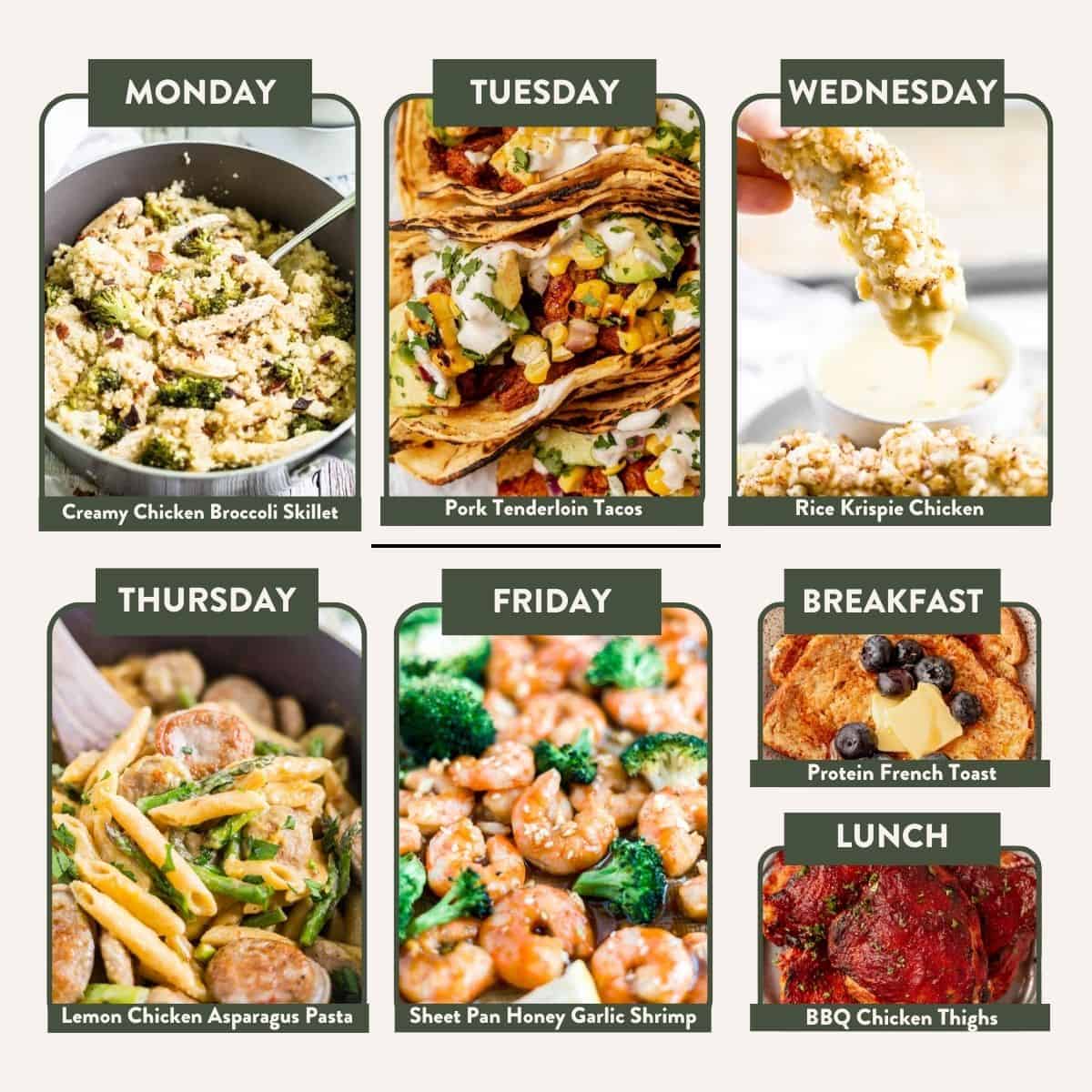 Monday: Creamy Chicken Broccoli Quinoa Skillet | Tuesday: Pork Tenderloin Tacos | Wednesday: Rice Krispie Chicken with Kale Apple Salad | Thursday: One Pot Lemon Chicken Asparagus Pasta | Friday: Sheet Pan Honey Garlic Shrimp with Coconut Rice | Breakfast: Protein French Toast | Lunch: BBQ Chicken Thighs