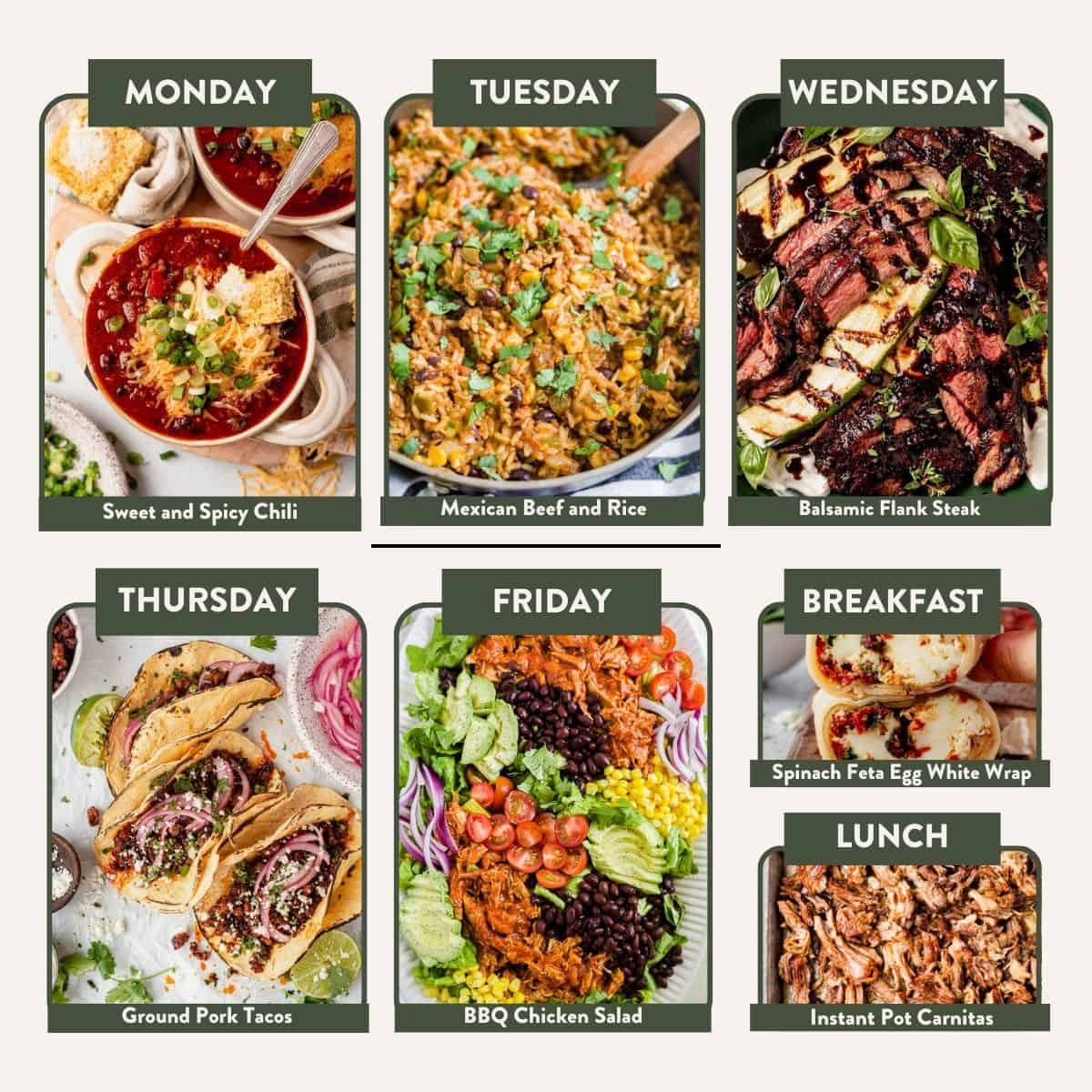 Monday: Sweet and Spicy Chili | Tuesday: Mexican Beef and Rice | Wednesday: Balsamic Flank Steak with Zucchini and Whipped Feta | Thursday: Ground Pork Tacos with Garlic Roasted Mini Peppers | Friday: BBQ Chicken Salad | Breakfast: Spinach Feta Egg White Wrap | Lunch: Instant Pot Carnitas