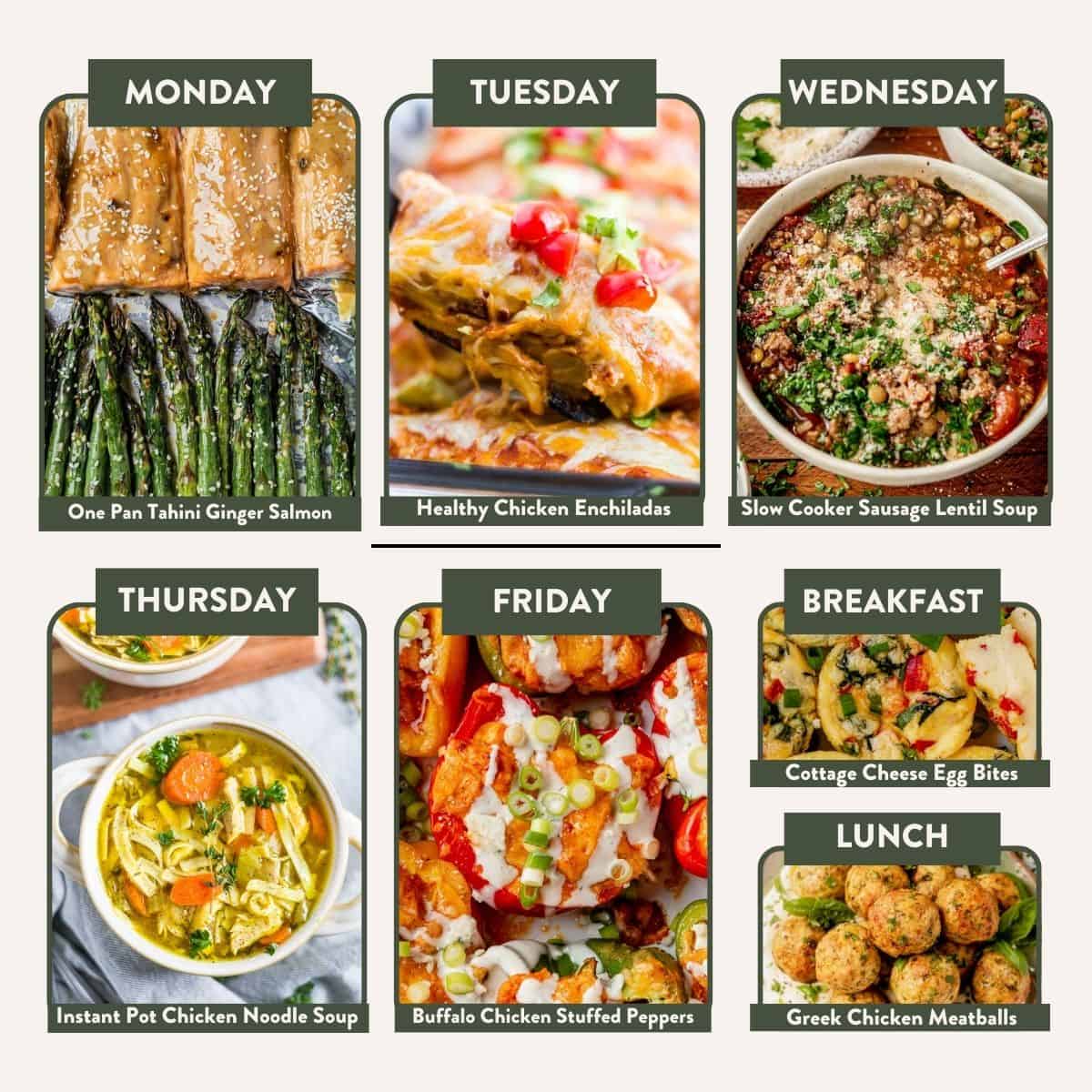 Monday: One Pan Tahini Ginger Salmon | Tuesday: Healthy Chicken Enchiladas | Wednesday: Slow Cooker Sausage Lentil Soup | Thursday: Instant Pot Chicken Noodle Soup | Friday: Buffalo Chicken Stuffed Peppers | Breakfast: Cottage Cheese Egg Bites | Lunch: Greek Chicken Meatballs