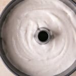 Scrape the batter into a 10-inch angel food cake pan (tube pan). Do NOT grease the pan.