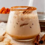 This Pumpkin Spice White Russian puts a fall twist on a classic white Russian cocktail. This smooth cocktail features a delicious blend of creamy coffee, rich pumpkin, and warm spices. It's served on the rocks, finished with a cinnamon sugar rim, and garnished with whole cinnamon sticks. It truly has all of the cozy flavors of fall.